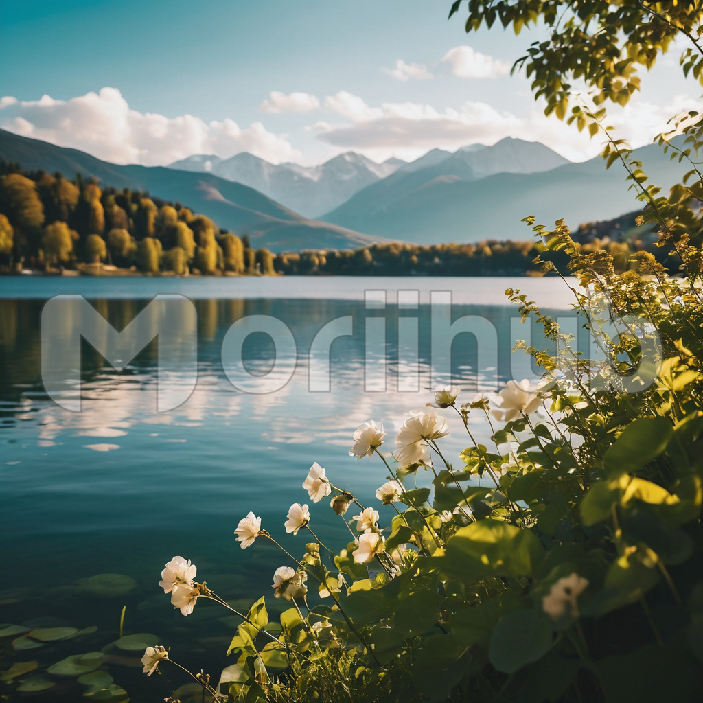 Amidst the serene expanse of the lake, verdant greenery flourishes along the water’s edge, a testament to nature’s vibrant embrace. In the distance, majestic mountains rise, their peaks shrouded in mist beneath the cloudy sky. The tranquil scene evokes a sense of awe and tranquility, as the elements of earth and sky converge in a harmonious tableau, inviting contemplation amidst the timeless beauty of the natural world.