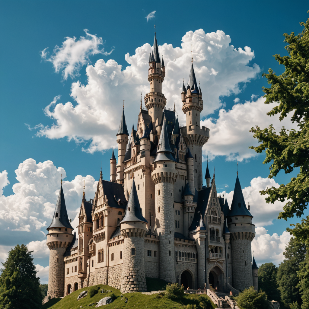 Against a backdrop of billowing clouds, a majestic castle rises, its towering spires piercing the heavens. Built of weathered stone, it exudes an aura of ancient grandeur and resilience. Turrets reach skyward like guardians of the realm, while ramparts stand strong against the shifting clouds. Despite the looming sky, the castle remains a beacon of strength and majesty, a testament to the enduring spirit of its builders and the tales whispered within its walls.