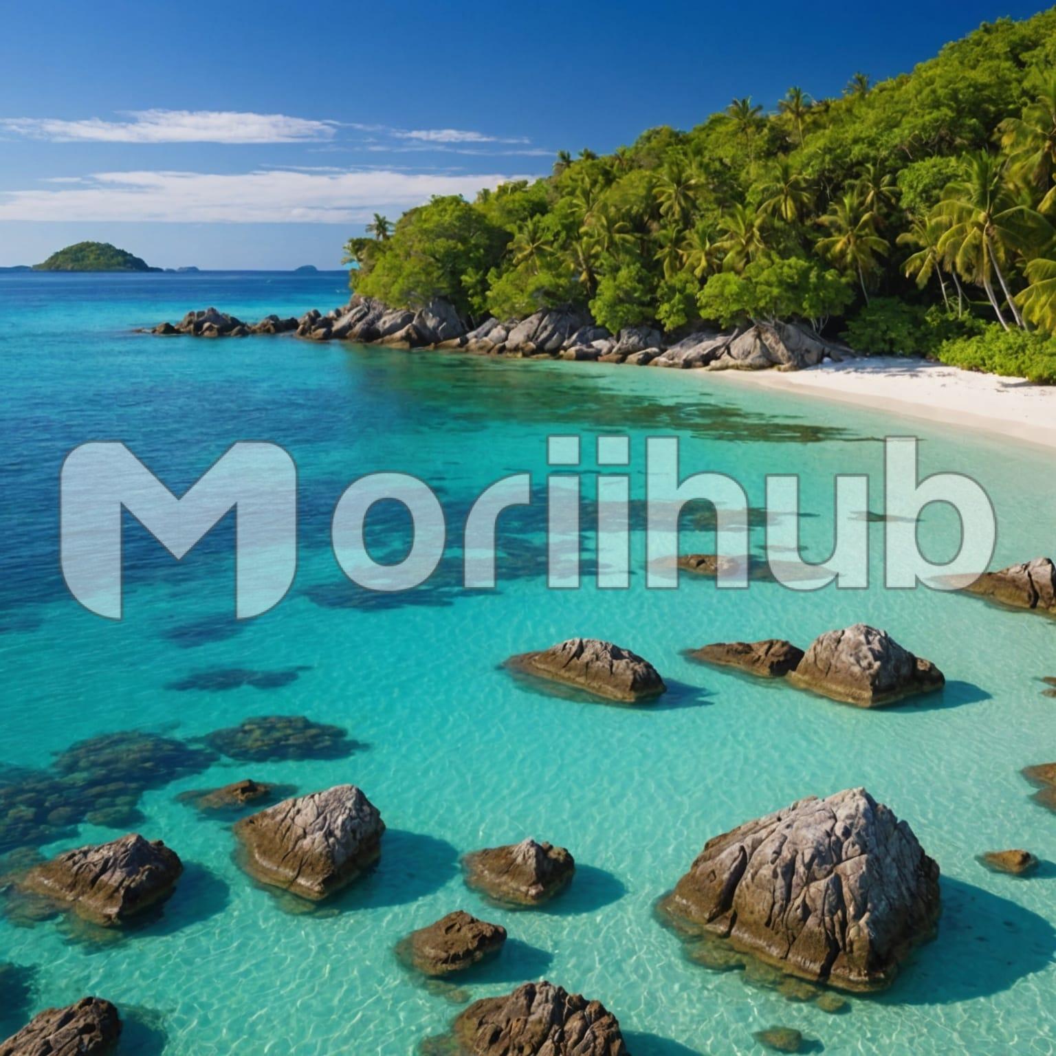 Crystal-clear waters gently lap against a pristine beach scattered with a couple of small boulders. The sunlight reflects off the tranquil surface, creating a shimmering dance of light. Lush greenery lines the sandy shore, framing the scene with vibrant foliage and adding a touch of natural serenity. Above, the sky stretches endlessly in a clear, deep blue hue, sparse clouds in sight. This tranquil coastal vista, with its perfect blend of clear waters, rocky accents, verdant greenery, and expansive sky, invites a sense of peace and connection with nature.