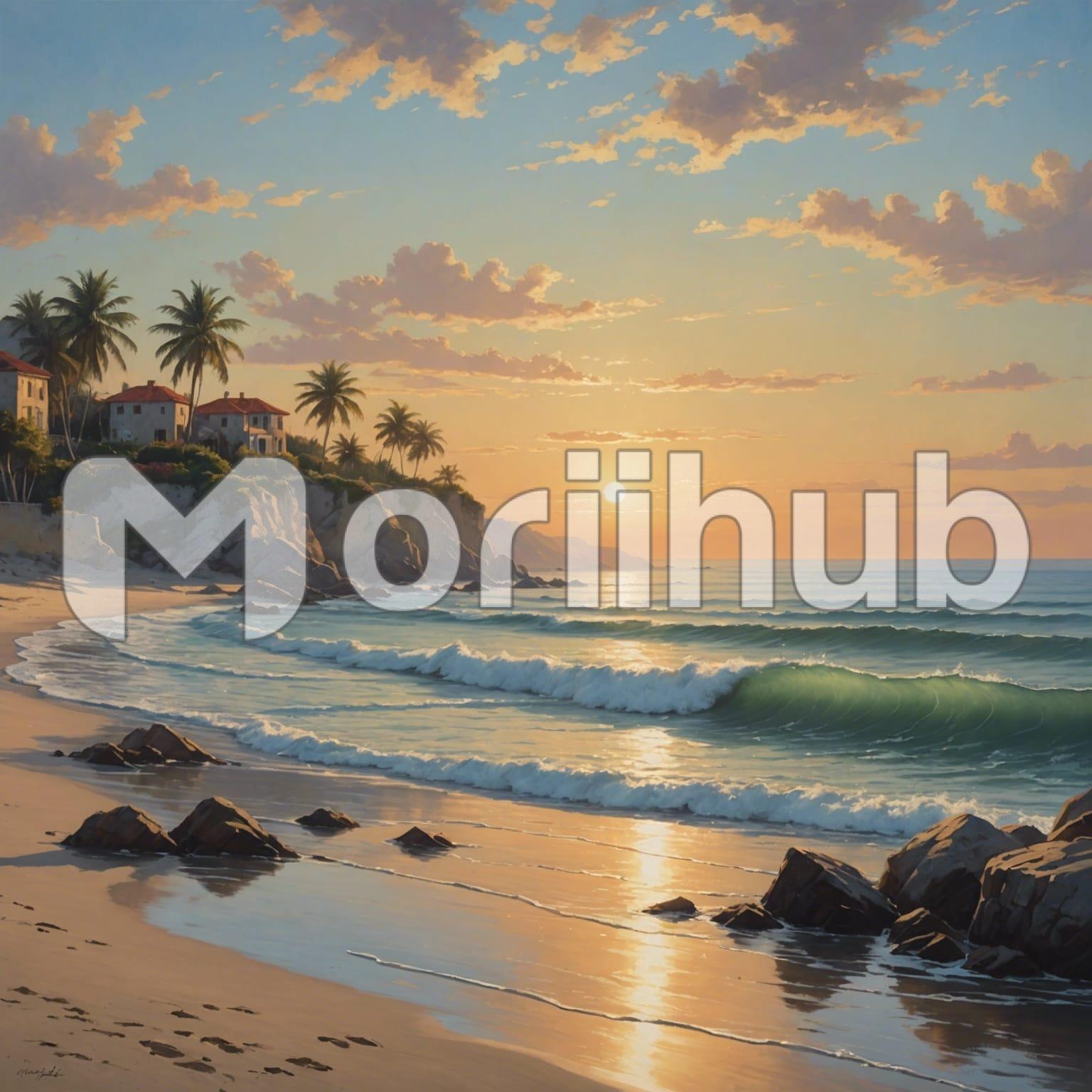As the sun dips below the horizon, casting a warm, golden glow over the beach, the sky transforms into a canvas of vibrant hues. Waves gently caress the shore, their rhythmic lullaby harmonizing with the whispers of the evening breeze. In the distance, a verdant hill rises, adorned with lush greenery that catches the last rays of sunlight. Nestled against the hillside, quaint houses stand, their silhouettes outlined against the fading light. In this serene moment, nature and civilization unite in a symphony of beauty, capturing the essence of coastal tranquility.