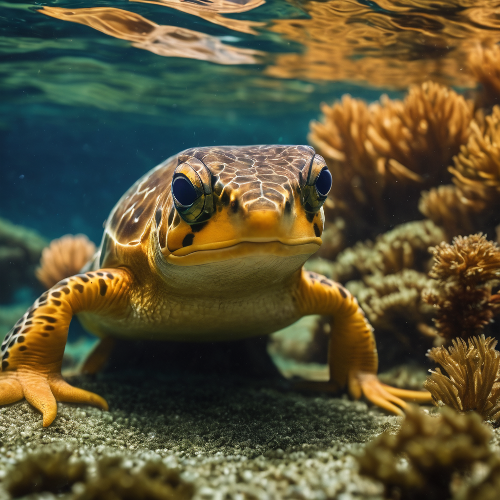 The underwater frog is a mesmerizing spectacle of aquatic elegance, adorned in a symphony of vibrant hues. Its supple skin showcases a spectrum of aquatic blues, from tranquil azure to deep indigo. Golden streaks shimmer along its limbs, mirroring the dappled sunlight filtering through the water, creating a living kaleidoscope beneath the waves.