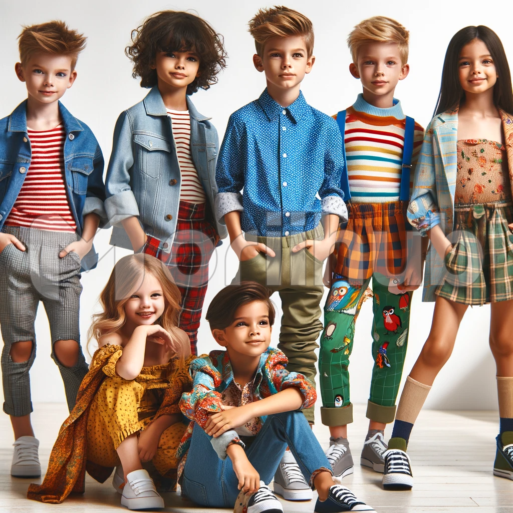 In this vibrant and youthful tableau, a group of children radiate joy and style in their trendy, age-appropriate outfits. The color palette is a playful symphony, with a mix of pastel pinks, bright blues, and sunshine yellows. These fashion-forward kids don playful patterns, with skirts, suspenders, polka-dotted dresses, and sneakers that exude an effortless blend of fashion and fun. Their outfits capture the essence of youthful exuberance, celebrating individuality and creativity while remaining stylish and age-appropriate.