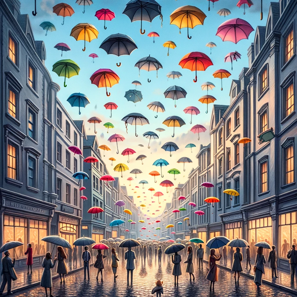 In this whimsical tableau, the sky is a canvas of soft, overcast blue, adorned with a spectacle unlike any other. Instead of raindrops, a shower of colorful umbrellas descends gracefully from above, each one unique in design and hue. They tumble and twirl through the air, creating a mesmerizing display of whimsy and wonder.