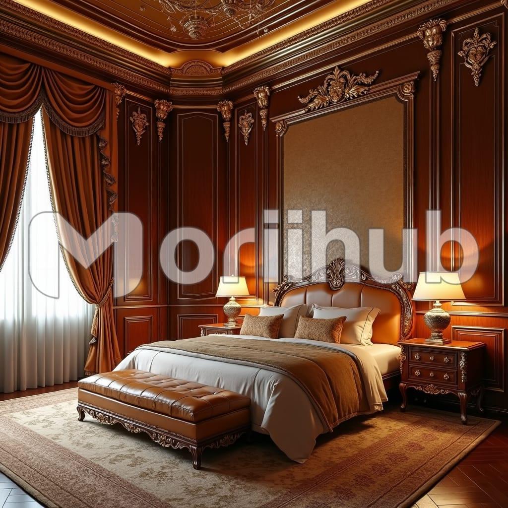 The bedroom exudes calm and warmth, centered by a large bed with crisp linens. On either side, sleek nightstands hold lamps, casting a gentle glow over the space. The lamps create a soft, ambient light that frames the bed, enhancing the room’s cozy feel. Behind the bed, a minimalistic headboard complements the balanced layout, with subtle decor adding character without clutter. The overall design reflects simplicity and comfort, inviting relaxation. This arrangement makes the room feel welcoming, with the gentle lighting creating a serene, restful atmosphere.