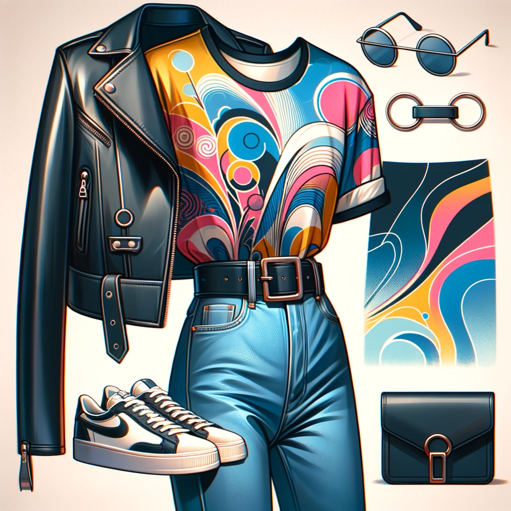 In the captivating illustration, a stylish ensemble for a young adult takes center stage. A fitted, high-waisted pair of trousers in a bold, eye-catching color anchors the look, exuding contemporary flair. Paired with a cropped, sleeveless top boasting intricate patterns, the outfit emanates youthful sophistication and confidence. Completing the ensemble, sleek accessories add a touch of understated elegance.