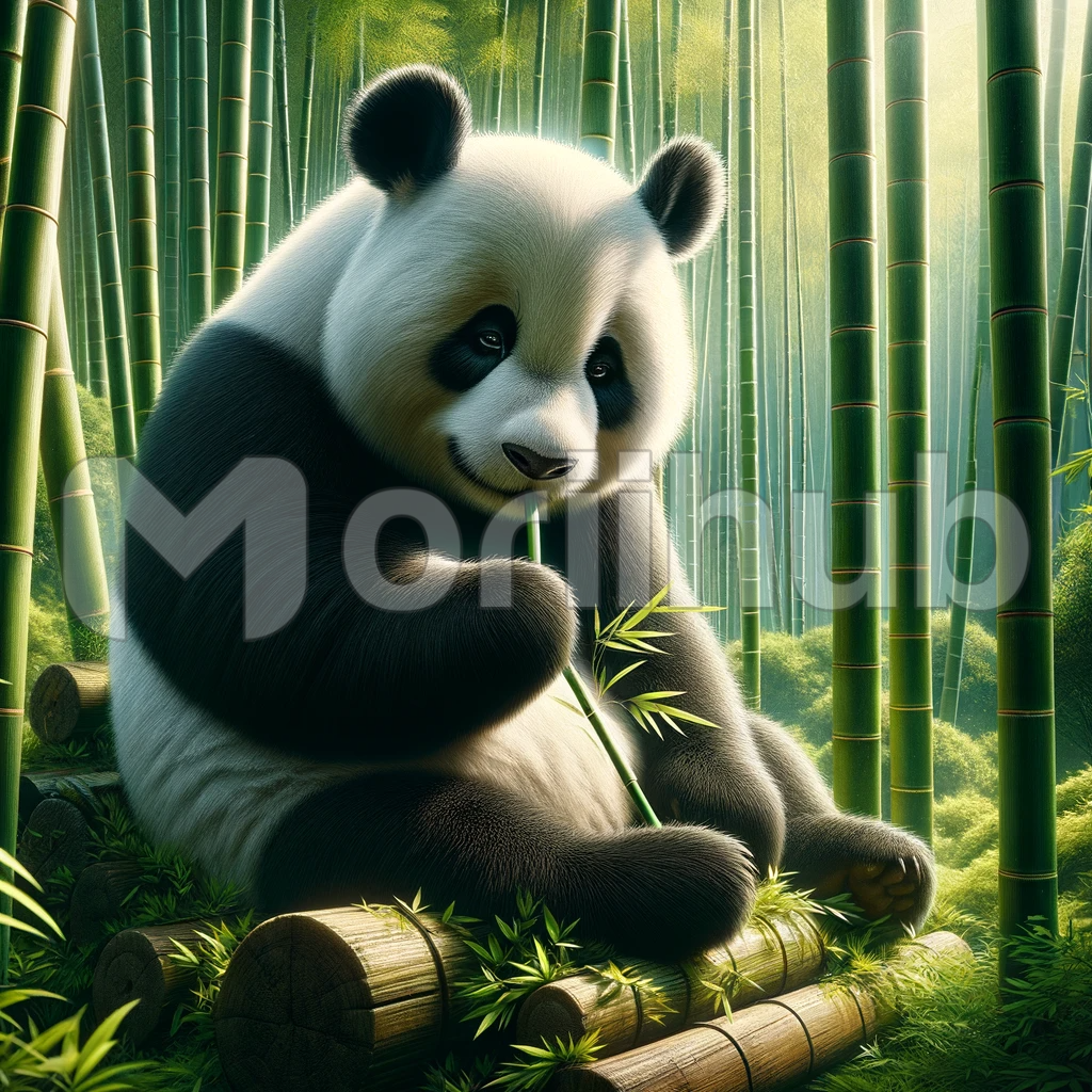In this captivating image, a giant panda resides in its lush bamboo forest habitat, a vision of tranquility and contentment. The panda’s fur, a harmonious blend of black and white, complements the vibrant greenery surrounding it. With a peaceful and content expression, it epitomizes the serene harmony between this beloved bear and its natural home, symbolizing the delicate balance of life within the bamboo groves.