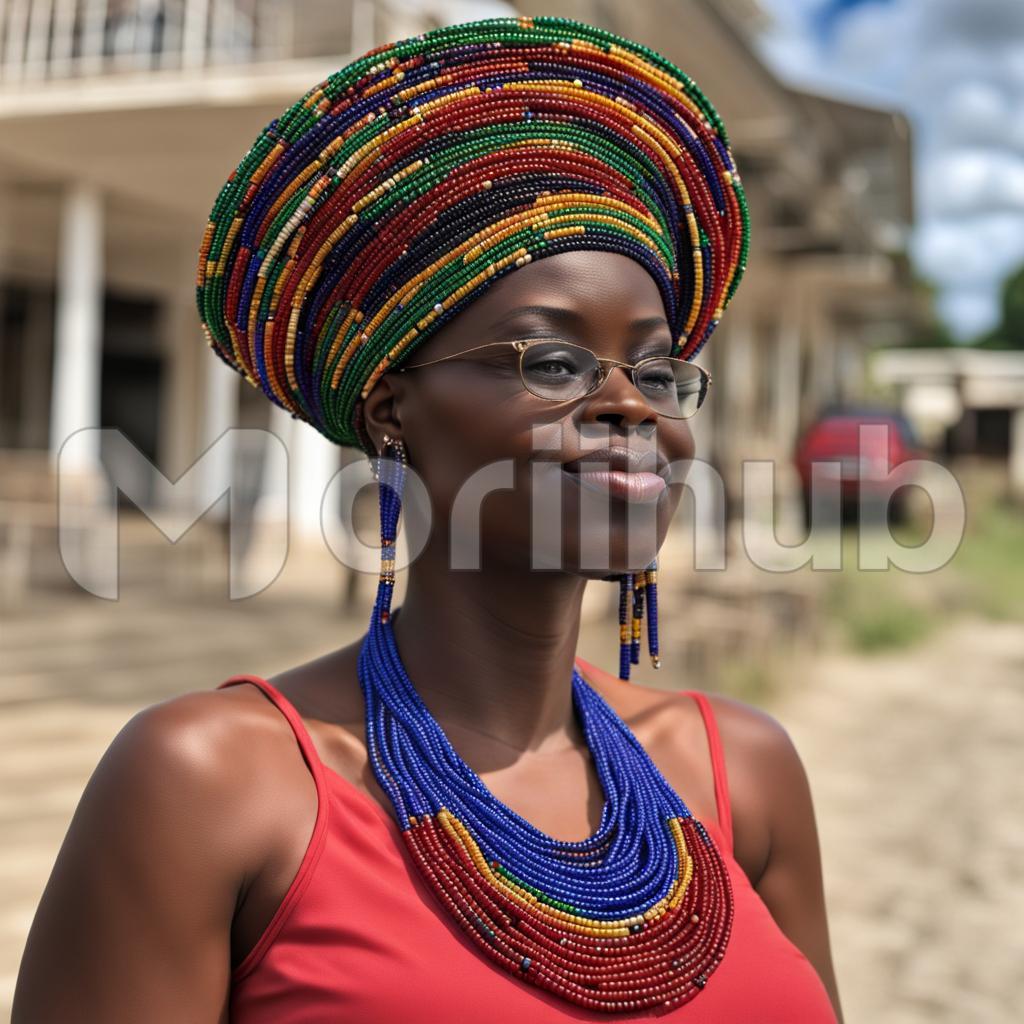 An exquisite woman graces the scene, adorned in a beaded headpiece and necklace that accentuate her natural allure. Her glasses add an intellectual charm, framing eyes that radiate wisdom and curiosity. Each bead reflects her unique elegance, intertwining cultural grace with contemporary refinement. With effortless grace, she carries herself, embodying a harmonious fusion of tradition and modernity, a living canvas where beauty, intellect, and cultural identity converge with captivating brilliance.