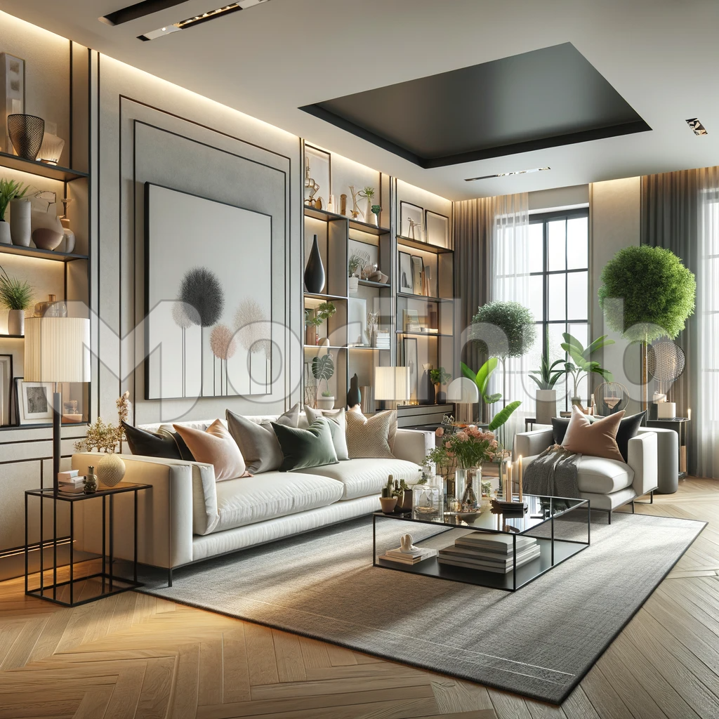 The beautifully designed home interior exudes a modern and stylish ambiance, prominently showcasing a contemporary living room. Clean lines and minimalistic elegance define the space, with sleek furniture and neutral tones creating a harmonious atmosphere. Large windows allow natural light to flood in, illuminating the room’s chic decor, including abstract artwork, designer furnishings, and carefully selected accents. The result is a sophisticated living area that seamlessly merges functionality with aesthetic appeal, a testament to the artistry of modern design.