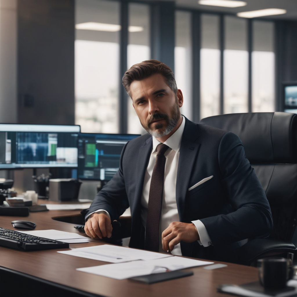 In the commanding ambiance of his office, a man dons a sleek suit, an embodiment of professional elegance. With hands gently raised, he surveys the realm of productivity, gaze fixed sideways, contemplating strategic moves. An open document on his desk and the visible keyboard hint at the orchestrated symphony of workflow, where the man orchestrates the dance of ideas and actions, seamlessly navigating the corporate canvas with a poised demeanor.
