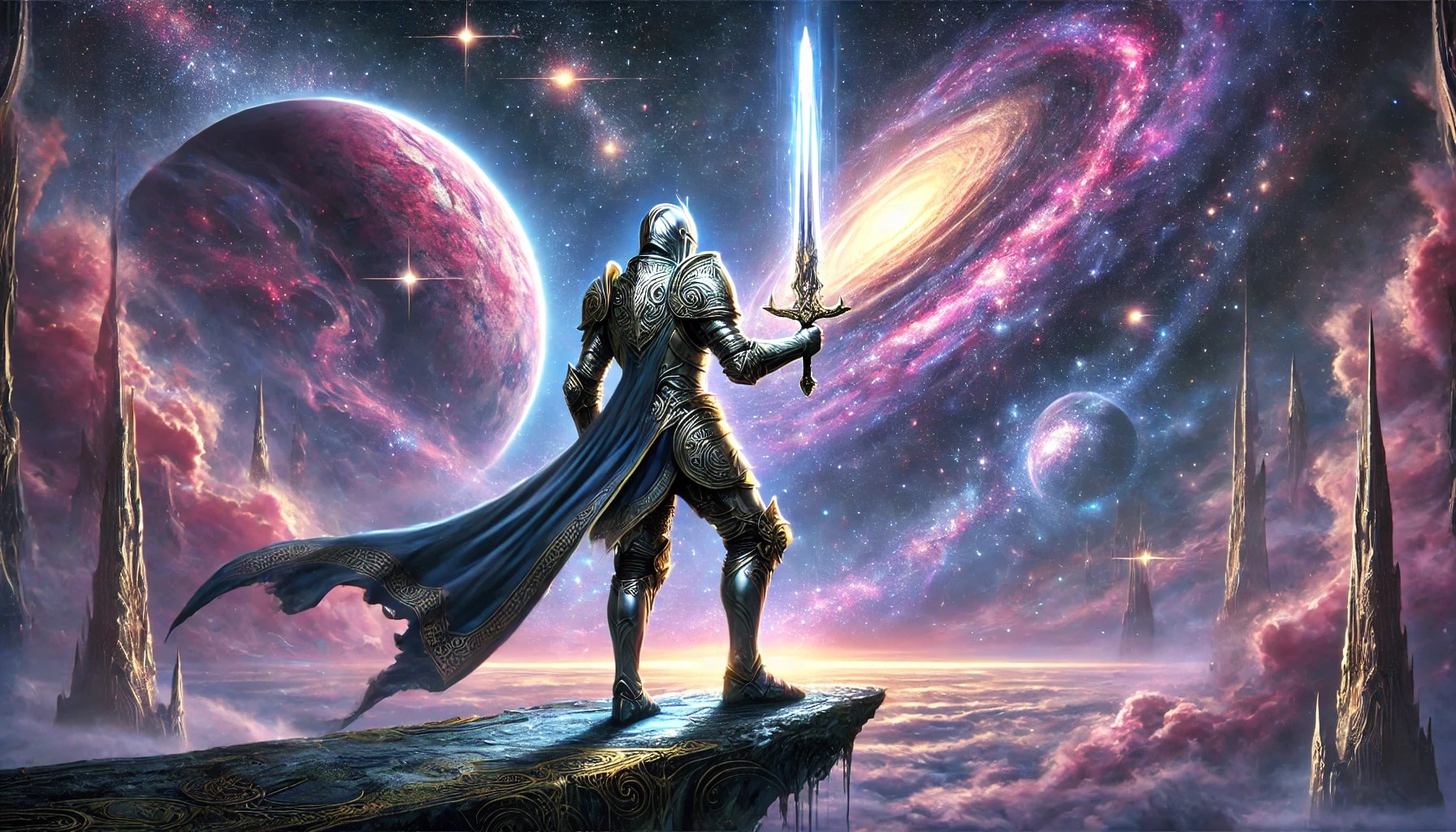 The illustration depicts a digital painting of a warrior standing at the edge of a cosmic cliff, gazing out into the vastness of space. The warrior is dressed in shimmering silver armor, engraved with intricate designs that catch the light from distant stars. They hold a glowing sword, raised high, reflecting the celestial bodies around them. Their helmet has a sleek, futuristic look, complementing the majestic and heroic posture.