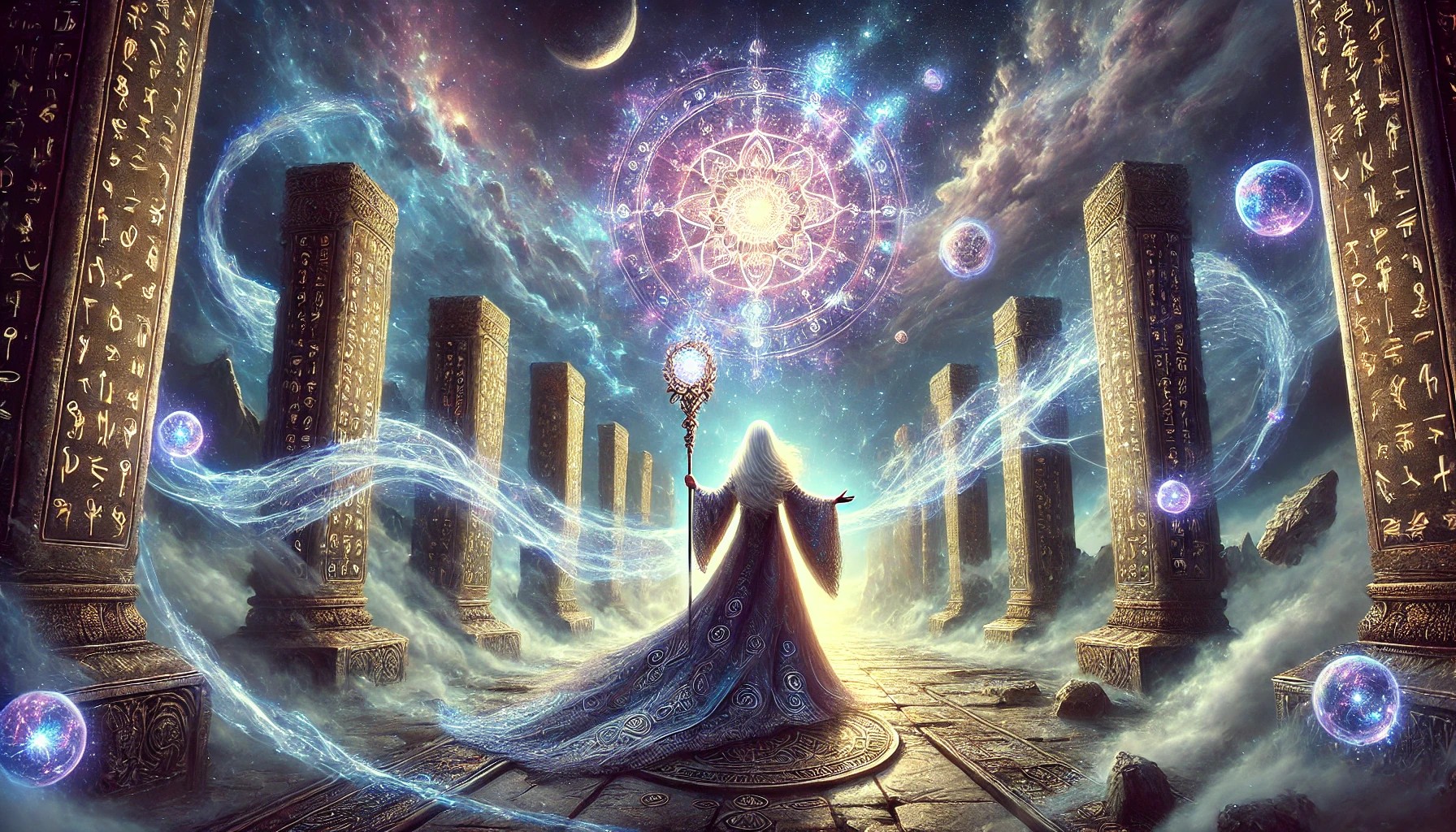 This illustration captures a mystical moment steeped in the theme of fate. A powerful oracle stands before a celestial gateway, her flowing robes inscribed with glowing runes that pulse with an ancient magic. In her grasp, an ancient staff radiates divine energy, and from her fingertips, ethereal threads of fate weave through the air—shimmering silver strands that seem to bind the universe together.