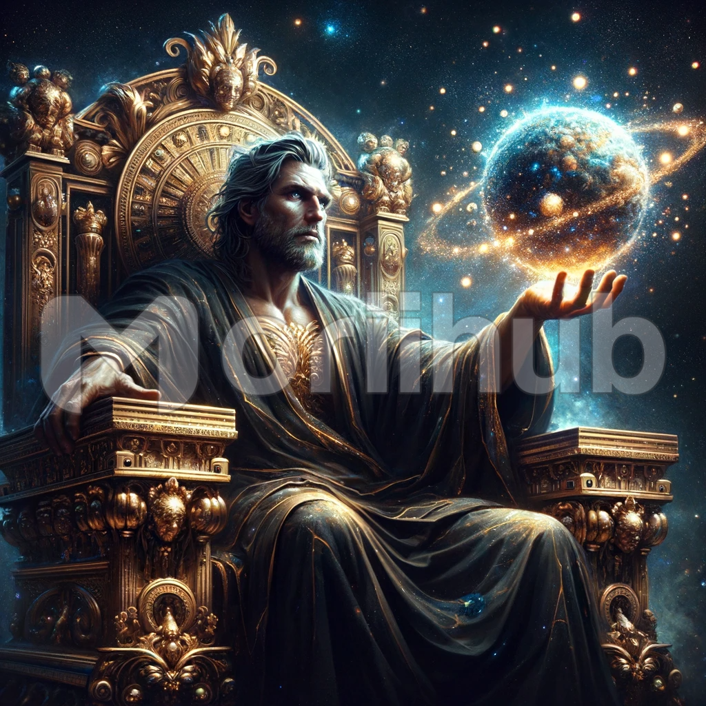 In the cosmic void, a regal figure sits upon an ethereal throne, a master of the universe. His gaze is fixed upon a miniature cosmos cradled in his hand, a universe within his grasp. Celestial wonders dance around him, as he reigns over the vast expanse of space. With wisdom in his eyes and galaxies at his command, he embodies the majesty of creation itself, an omnipotent sovereign in the celestial realm.