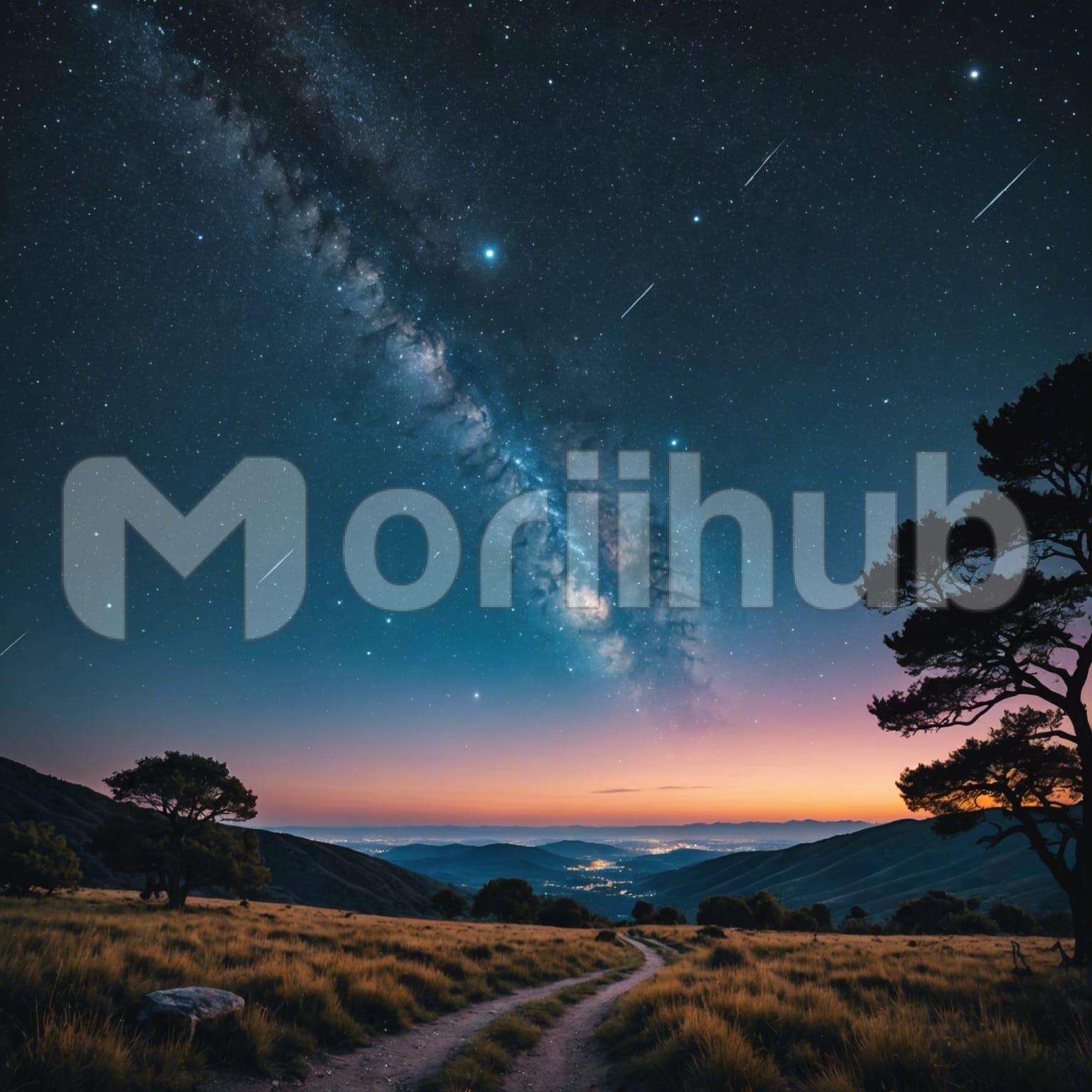 Above the tranquil field, the night sky unfolds in a breathtaking display of celestial wonder. Stars sprinkle the darkness like scattered jewels, their shimmering light reflecting off the dew-kissed grass below. A blanket of darkness stretches endlessly, punctuated by the distant glow of distant stars and galaxies. Tire tracks carve a winding path through the field, a testament to the journeys taken under the watchful gaze of the heavens. In this serene setting, the beauty of nature and the cosmos merge, creating a scene of profound tranquility and awe-inspiring majesty.