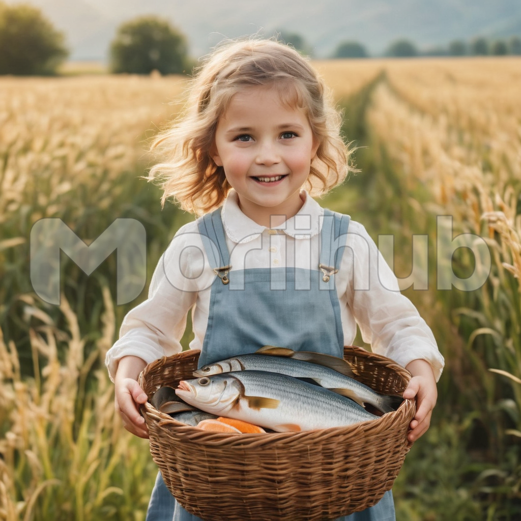 In a sun-drenched field, a cute little girl ambles gleefully, a basket of freshly caught fish cradled in her arms. Her small feet dance amidst the tall grass, her laughter blending with the melody of chirping birds. With each step, her eyes twinkle with excitement, her cheeks flushed with the thrill of her bounty. Amidst nature’s embrace, she radiates innocence and delight, a picture-perfect scene of childhood joy amidst the tranquility of the countryside.