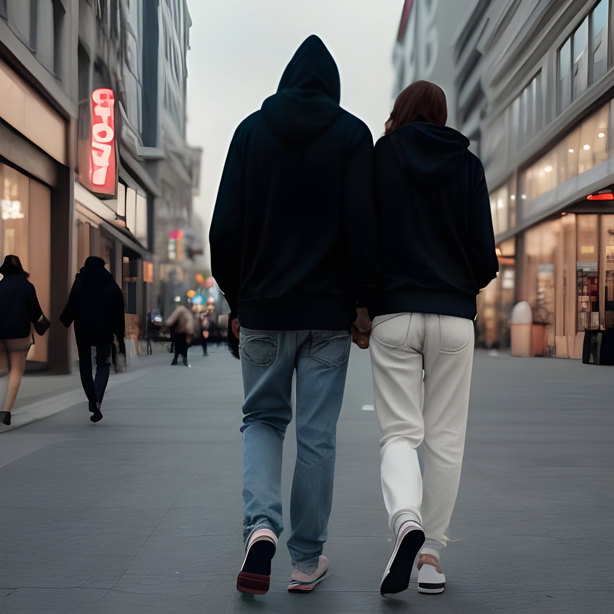 The couple strolled down the bustling street, their figures wrapped in the cozy embrace of matching hoodies. The back view revealed a scene of subtle intimacy as they walked in sync, their steps echoing a shared rhythm. The hoodies, slightly oversized, draped over their frames, creating a sense of unity in both style and movement.