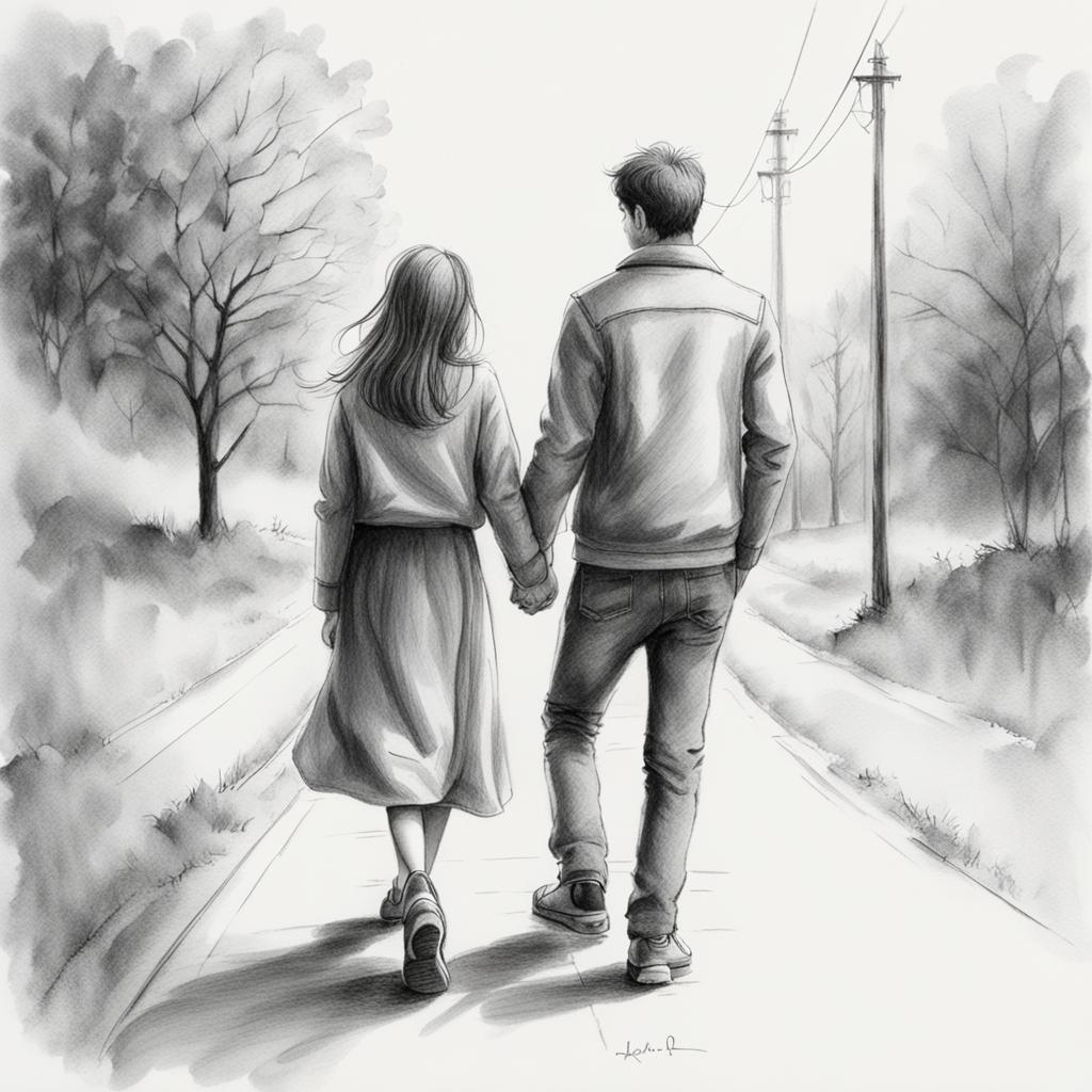 In a delicate pencil sketch, a couple walks hand in hand, their silhouettes etched with tender strokes upon the paper. The simplicity of the lines captures the essence of their bond, as they stroll together in perfect harmony. Their intertwined fingers speak volumes of love and companionship, while their shared stride portrays unity and mutual support. In this timeless moment frozen in graphite, the beauty of their connection is immortalized for eternity.