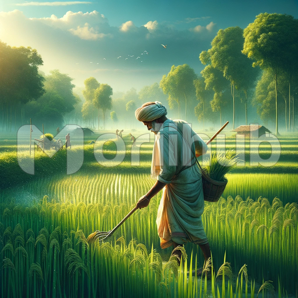 Visualize a picturesque rural scene in India, where an industrious farmer in traditional attire toils amidst lush, vibrant fields. With a weathered yet determined visage, they lovingly tend to the crops, their hands caressing the rich earth. The symphony of rustling leaves and the farmer’s diligent efforts paint a heartwarming portrait of agriculture’s enduring connection to the land.