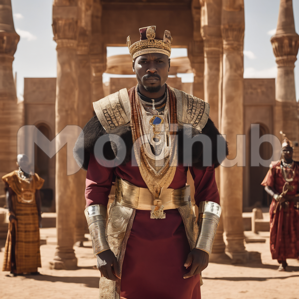 In the heart of Africa, an esteemed monarch stands with dignified bearing, adorned in traditional regalia. Beaded neckpieces cascade down his chest, accentuating his noble stature, while a resplendent crown rests atop his head, symbolizing his royal lineage. Behind him, attendants stand at attention, their presence a testament to his authority, framed by majestic columns that echo the grandeur of his rule. In this scene, the essence of African royalty radiates with timeless majesty.