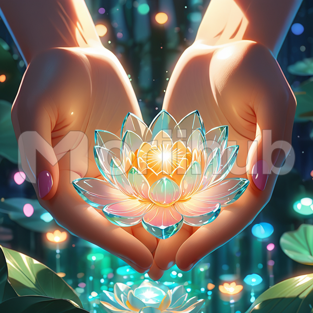 Cradled delicately in a palm, a glass lotus blooms gracefully above tranquil waters. Its transparent petals capture the gentle ripples below, refracting light into a myriad of colors that dance across the surface. Floating effortlessly, the lotus symbolizes purity and serenity, its ethereal beauty mirrored in the calm expanse of the water beneath. In this harmonious union of glass and nature, a moment of tranquility and enchantment unfolds.