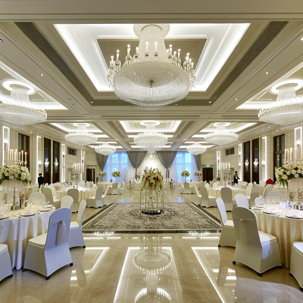 Welcome to a realm of luxury, where dreams become reality in a reception hall crafted for the most elegant of occasions. Its grand entrance beckons with resplendent crystal chandeliers, casting cascades of light upon polished marble floors. This opulent space, ideal for weddings, galas, and formal affairs, sets the stage for unforgettable moments amidst timeless sophistication and refined beauty.