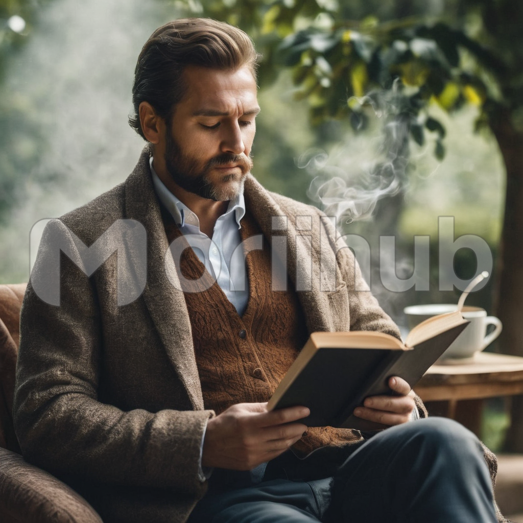 A dapper gentleman sits in timeless sophistication, engrossed in a book that transports him to distant realms. His stylish attire exudes confidence, and a meticulously prepared cup of coffee rests by his side, its aroma wafting through the air. Amidst the world’s chaos, he finds solace in the written word, a sanctuary of intellect and taste, where his passion for literature and refinement converge in quiet elegance.