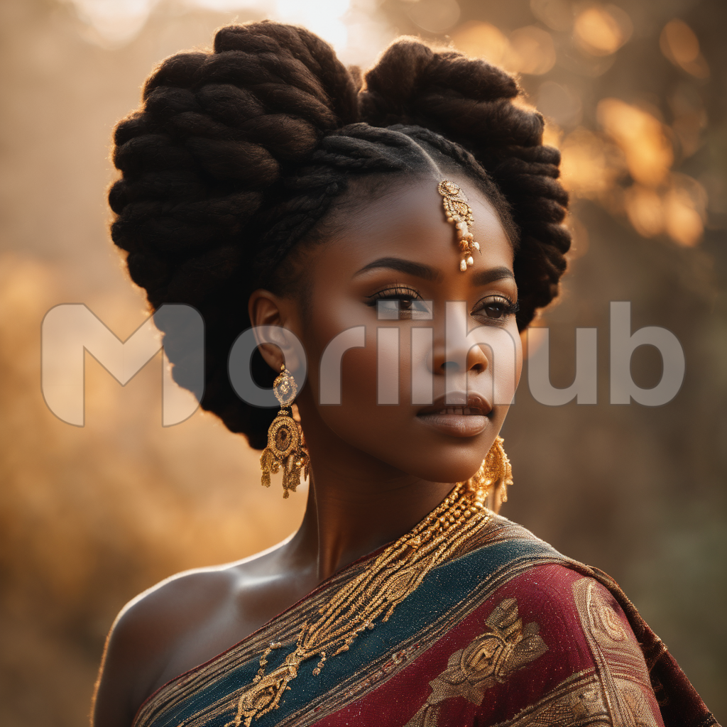 In resplendent grace, an African woman stands adorned, her gaze fixed into the distance. Intricately braided hair, secured in a regal bun, frames her radiant face. A golden adornment graces her forehead, a crown of cultural significance, while gleaming gold earrings accentuate her elegance. Poised and proud, she embodies a timeless beauty that transcends, a living canvas where heritage meets regality, and her eyes reflect the resilience of a storied past and the promise of a majestic future.