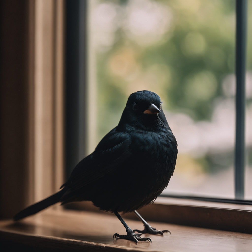 A sleek black bird perches on the windowsill, its feathers glistening in the soft indoor light. Its curious eyes observe the outside world from the comfort of a home, a stark contrast to the urban backdrop. The bird’s silhouette creates an elegant contrast against the window, casting shadows on the interior. Its presence adds a touch of nature to the domestic scene, bridging the wild and the familiar within the confines of a room.