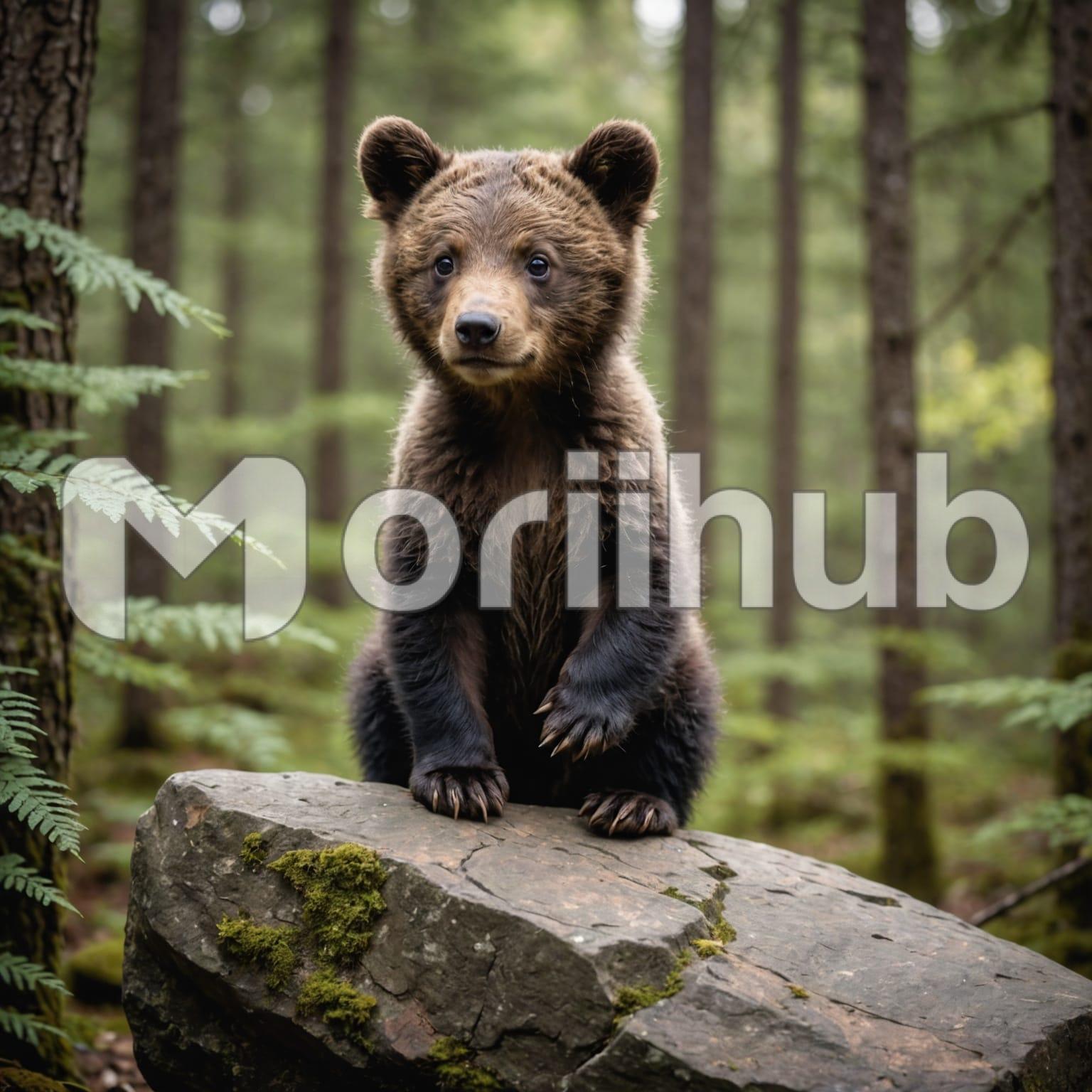 A bear cub perches atop a large boulder nestled in the woods, its small, furry frame contrasting with the rugged stone beneath it. The cub’s curious eyes scan its surroundings, while its soft, brown fur blends harmoniously with the natural setting. Surrounding the boulder, the dense forest provides a lush backdrop, with tall trees and underbrush creating a sense of seclusion. The cub’s playful stance and the serene woodland setting combine to evoke a sense of innocent exploration and natural beauty in this tranquil environment.