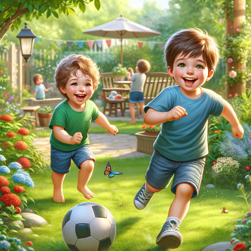 In a picturesque garden, two brothers revel in their youthful exuberance. The older sibling, approximately eight years of age, dons a vibrant blue t-shirt and shorts, showcasing his carefree spirit. His short, curly brown hair bounces with each giggle as they engage in playful adventures amid the blooming flora. The garden becomes a canvas for their innocent joy, as they explore, laugh, and create precious childhood memories together.