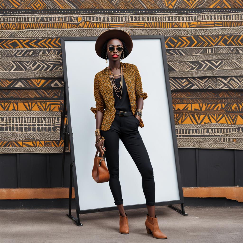 In a stunning display of urban chic, a black model commands attention with a sophisticated ensemble. She wears stylish glasses that accentuate her poised gaze, complemented by a hat that adds a touch of flair. Her boots and trousers exude contemporary edge, while a stylish suit jacket over a black top epitomizes elegance. A beaded neckpiece provides a cultural flourish. In a confident pose, she holds a bag with one hand, embodying a seamless blend of fashion-forward sophistication and cultural pride.