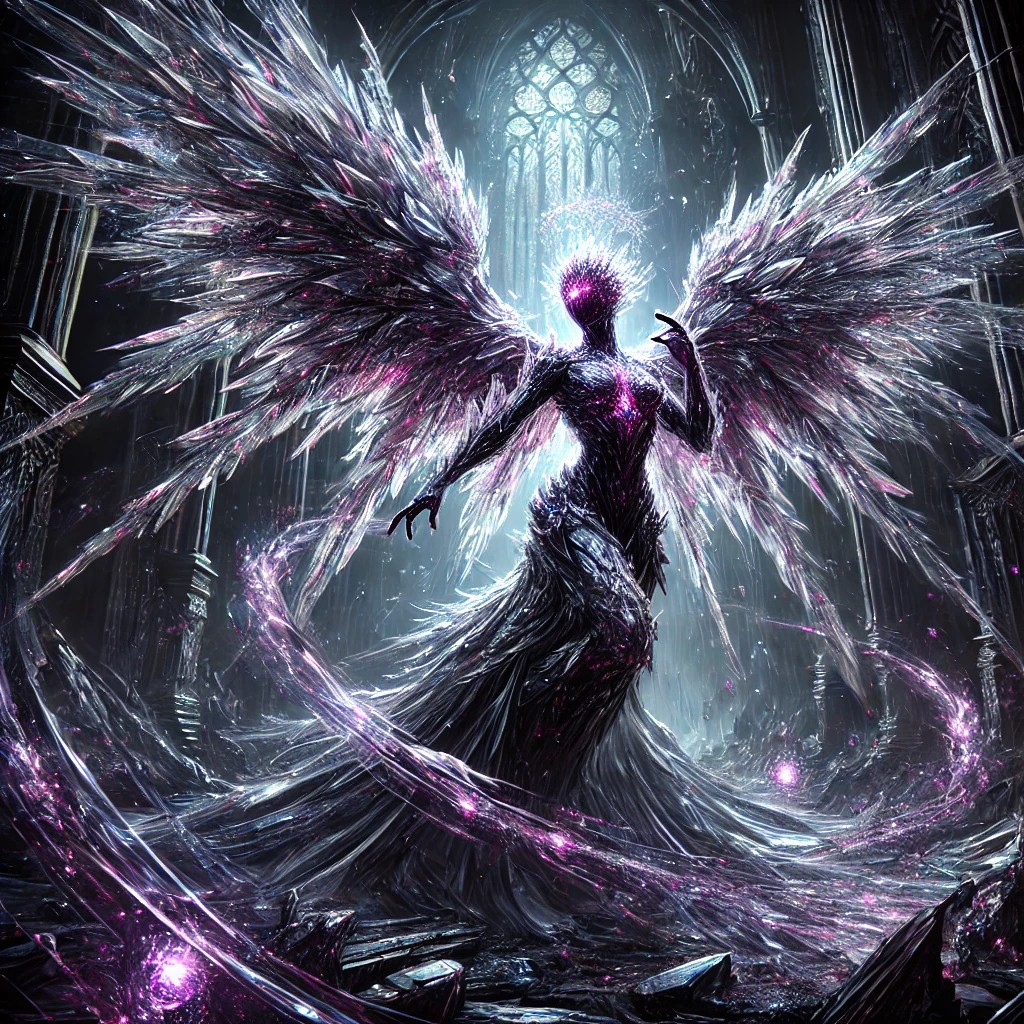 This breathtaking artwork features a Crystal Angel infused with the element of darkness, an awe-inspiring being of both beauty and mystery. Its tall, imposing figure is composed of translucent, jagged crystal shards, shimmering with a deep, shadowy glow that pulses with raw energy. Its massive, outstretched wings, formed from razor-sharp crystal, refract eerie hues of black and violet, creating a haunting yet divine presence.