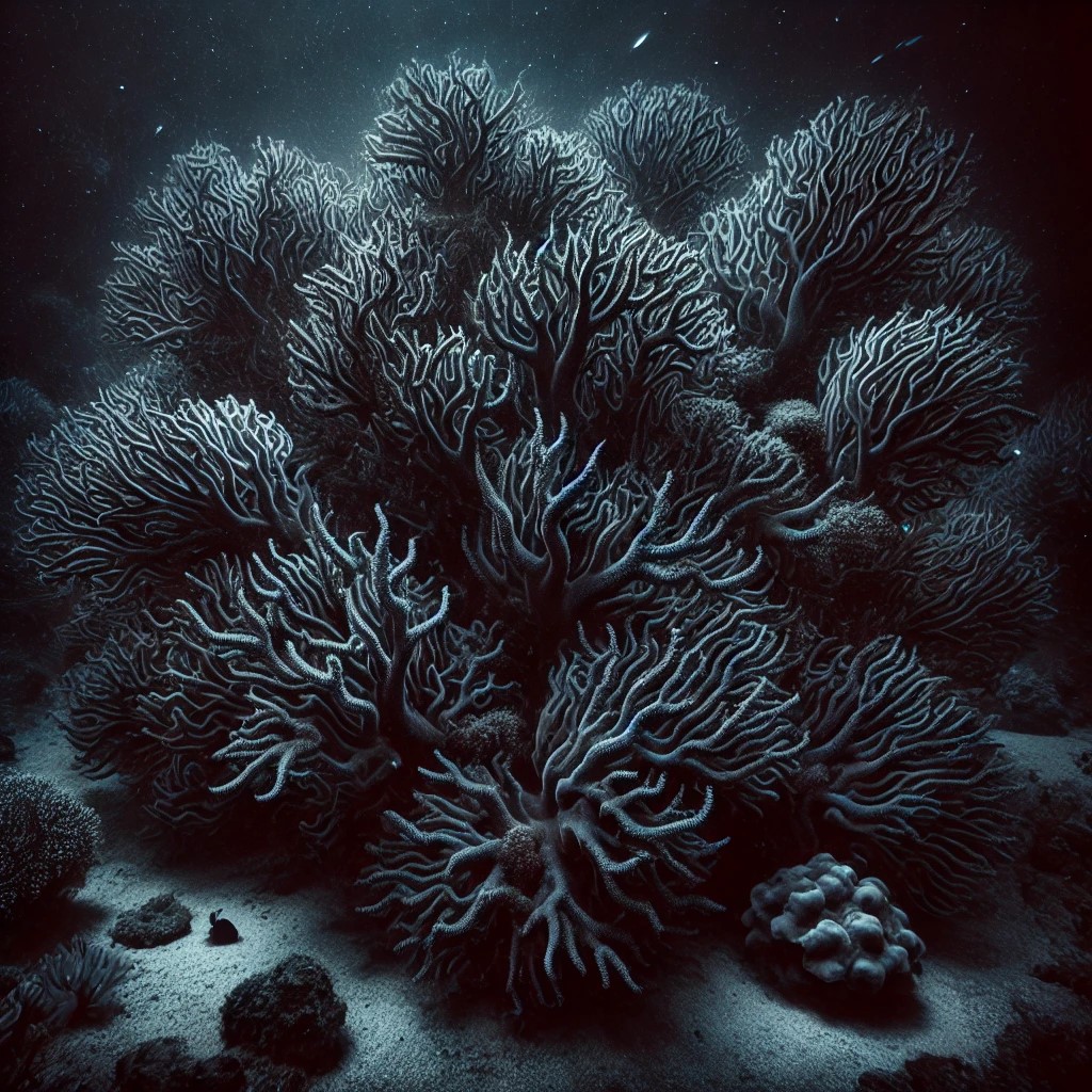 Darkness coral growing in the shadowy depths of the ocean, where light barely reaches. This coral is mysterious and foreboding, with twisted, gnarled branches that seem to absorb the surrounding light, creating an aura of darkness around it. The coral is a deep, almost black color, with subtle hints of dark purples and midnight blues that give it an eerie, otherworldly appearance. Its surface is rough and jagged, with sharp, spike-like protrusions that add to its menacing look.