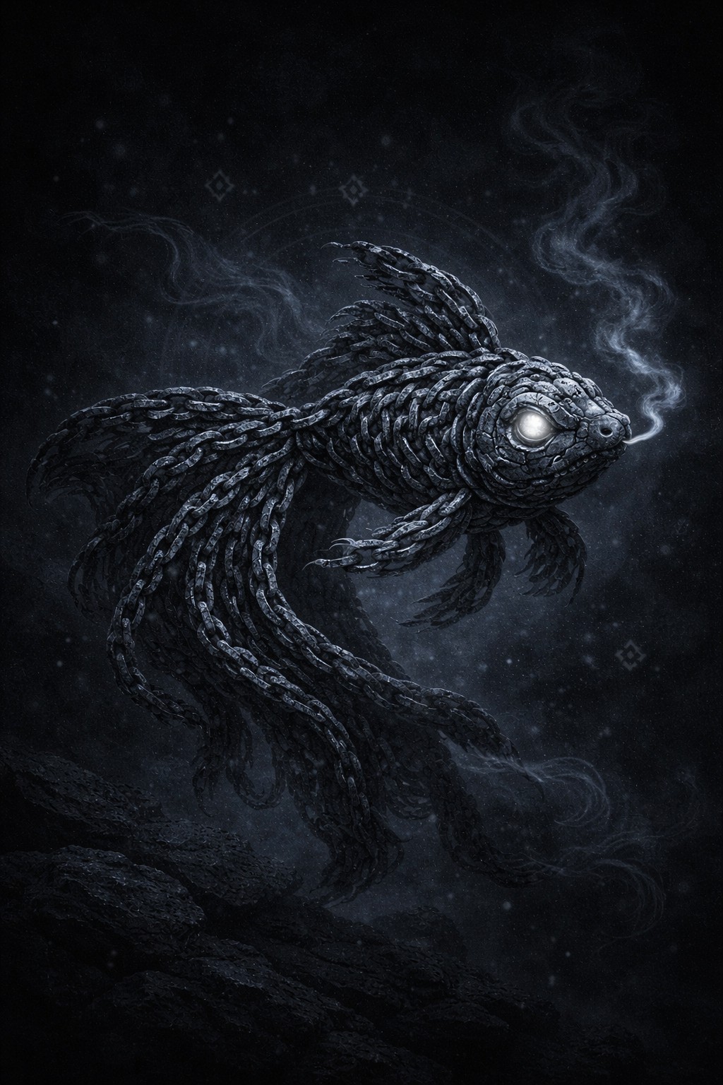 The image depicts a dark and gothic-style goldfish, its body intricately formed from interwoven metal chains. The chains create a textured, almost stone-like appearance, giving the fish a robust and ominous feel. The goldfish’s glowing white eyes shine with an eerie light, and tendrils of smoky vapor rise from its mouth, adding a supernatural, haunting element.