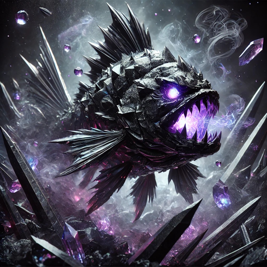 A dark crystal piranha, sculpted from sharp, jagged black crystals, glowing with eerie purple and blue energy.