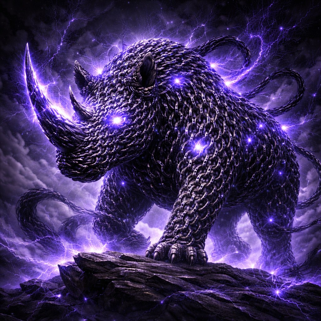 A hulking rhinoceros made entirely of black iron chains crouches atop jagged rock, like a living fortress of metal and shadow. Each heavy link overlaps the next to form thick plates of “armor,” catching only the faintest glints of cold light. Between the chains, eerie violet energy smolders and flares, gathering brightest around its massive horn and burning eyes.
