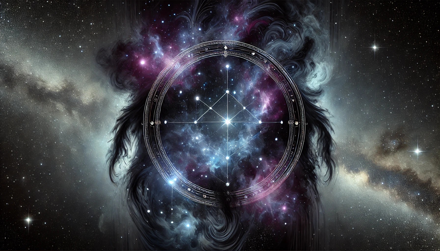 The image showcases a mesmerizing celestial shield-shaped constellation, glowing with an eerie, dark energy against the infinite backdrop of space. The shield is crafted from radiant stars, connected by delicate nebula-like trails of deep purple and black, forming an intricate and mystical structure.
