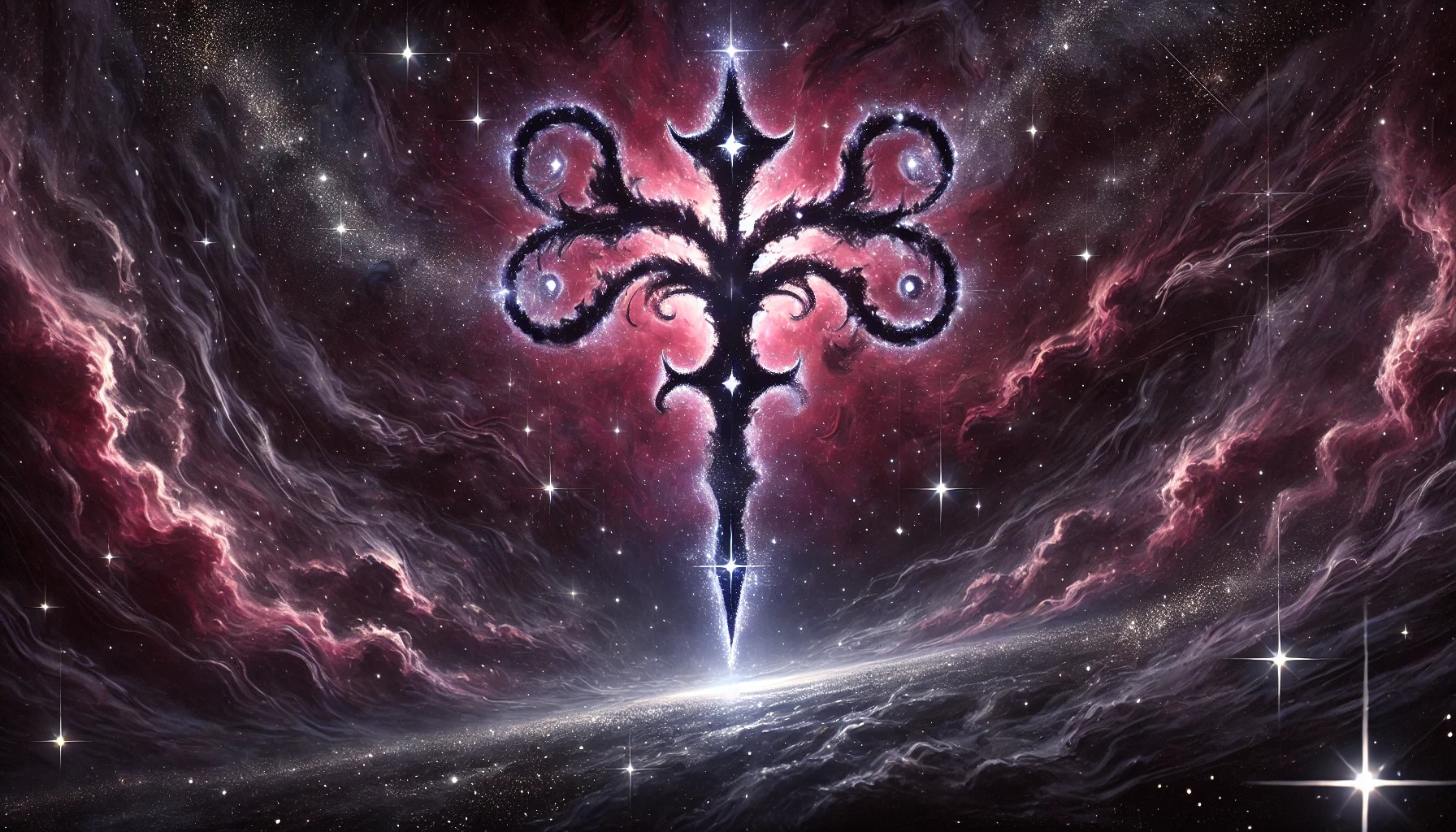 The image presents a celestial constellation in the shape of a sword, radiating a mysterious and shadowy energy. The sword is composed of interconnected dark stars, with subtle cosmic trails forming an intricate and mythical design. It emits an eerie glow of deep violet and dark crimson, symbolizing the darkness element and an ominous power.