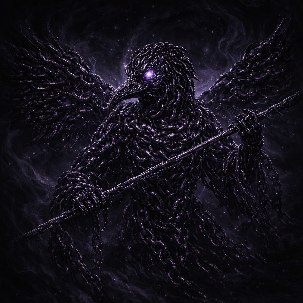 The tengu looms out of the darkness, its entire body sculpted from thick, interlocking chains that twist into the shape of a humanoid crow. Each feather of its wings is a braided length of metal, spreading wide behind it like jagged, steel plumage. Its head tapers into a sharp beak assembled from overlapping links, and from the shadowed socket of one eye burns a single, piercing violet glow.