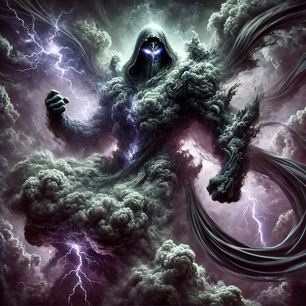 A towering, ominous cloud shaped like a fearsome warrior dominates the stormy night sky. The warrior’s broad shoulders and flowing cloak are formed from swirling dark mist, giving him a ghostly yet powerful presence. His glowing eyes pierce through the darkness, and his shadowy armor blends seamlessly into the surrounding storm clouds.