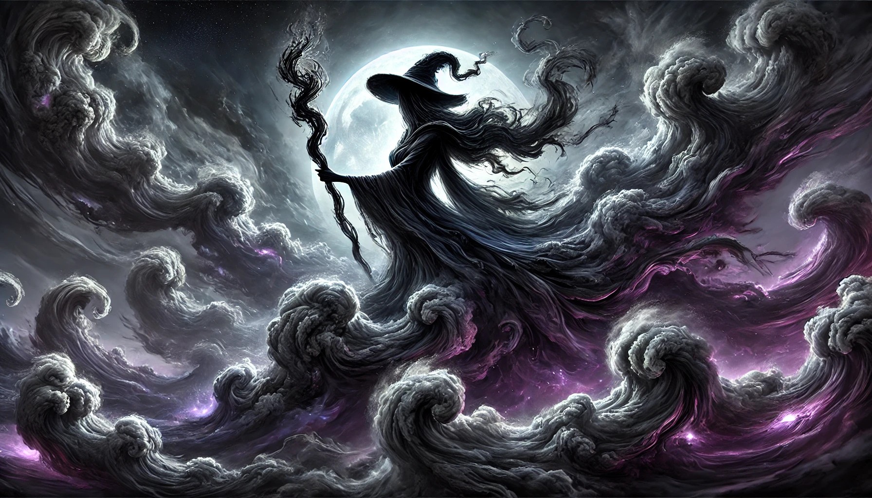 The image shows a haunting, supernatural night sky dominated by a cloud formation shaped like a dark and sinister witch casting a powerful spell. The witch’s body is crafted from dense, shadowy clouds, with flowing robes trailing like wisps of smoke into the night. Her extended arms hold a gnarled staff made of swirling darkness, and shadowy tendrils stretch outward, as if consuming the surrounding sky.
