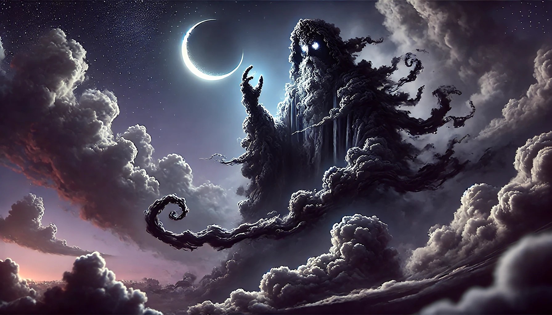 The image showcases a mysterious night sky dominated by a towering cloud formation shaped like a powerful wizard. The cloud wizard appears cloaked in flowing, dark robes made of dense, swirling clouds. One hand is raised high, casting shadowy tendrils of mist that twist and blend seamlessly into the surrounding night sky.