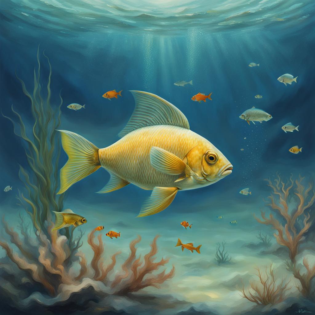 In the tranquil ocean depths, a vibrant fish captivates with its kaleidoscopic hues. Bathed in sunlight filtering through the calm water, the fish moves gracefully, its scales reflecting an array of colors – from electric blues to sunset oranges. Surrounding it, a diverse community of fellow fish glides in the distance, their silhouettes adding to the underwater spectacle. Seaweed sways gently, a testament to the serenity of the aquatic environment. The scene unfolds as a harmonious ballet of life, a vivid tapestry of nature’s wonders beneath the sunlit surface of the deep blue sea.