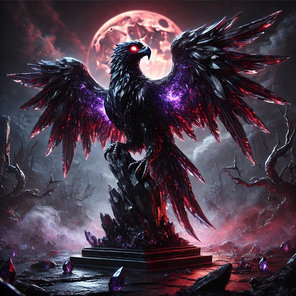 The image features a striking crystalline eagle sculpture, infused with the essence of death. The eagle is crafted from translucent black crystal, its body streaked with veins of deep purple and dark red that pulse with an eerie glow. The creature’s talons are sharp and poised, while its wings are slightly outstretched, each feather shimmering with a haunting aura of dark energy. The eagle’s eyes burn with a crimson light, exuding a sense of ancient, dangerous wisdom.