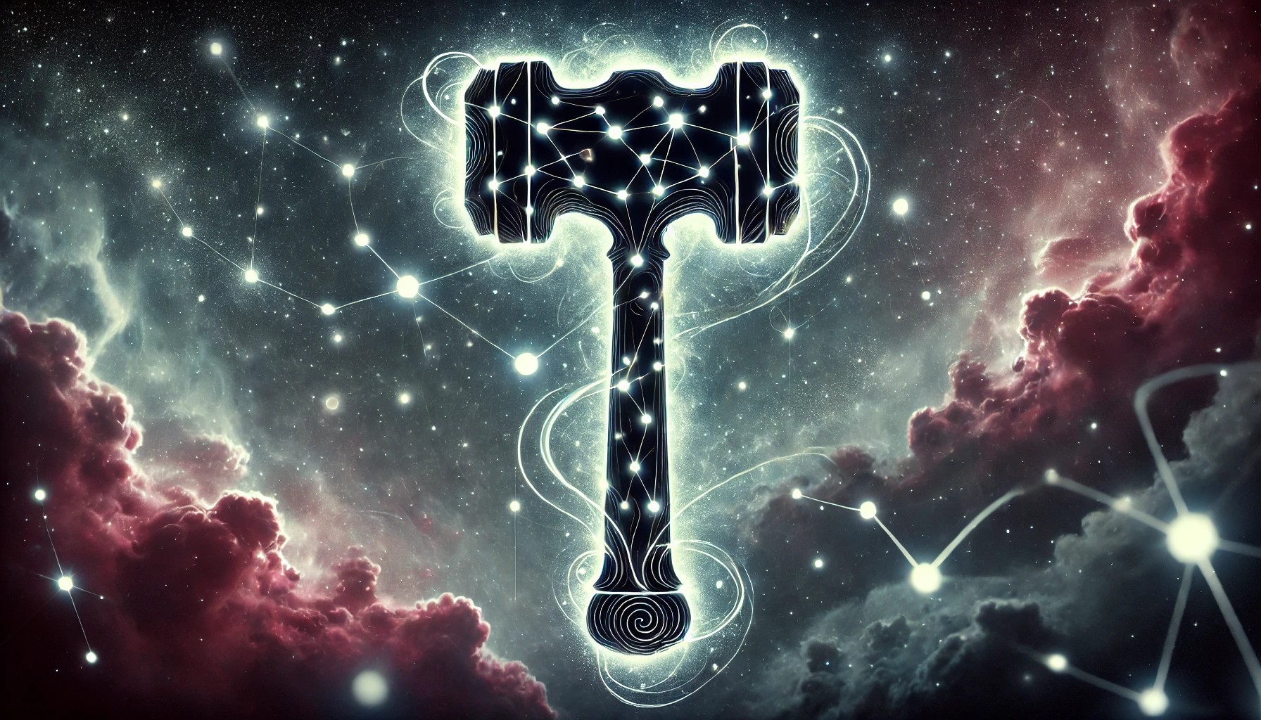 This artwork depicts a celestial constellation in the shape of a massive, mystical hammer. The hammer is outlined with glowing stars connected by shimmering lines, giving it a luminous, otherworldly presence. The head of the hammer radiates shadowy, smoky tendrils of energy, representing the element of death.