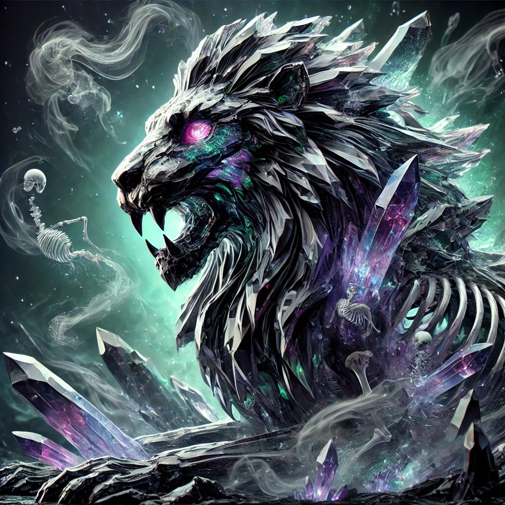 The image showcases a majestic crystal lion infused with the essence of death. The lion is sculpted from translucent black and deep purple crystals, exuding an ominous presence. Ethereal green and blue energy pulses through its jagged crystalline body, illuminating the cracks with an eerie glow. Its piercing red eyes radiate a sense of ancient power, while ghostly mist seeps from its fractures, enhancing its spectral aura.
