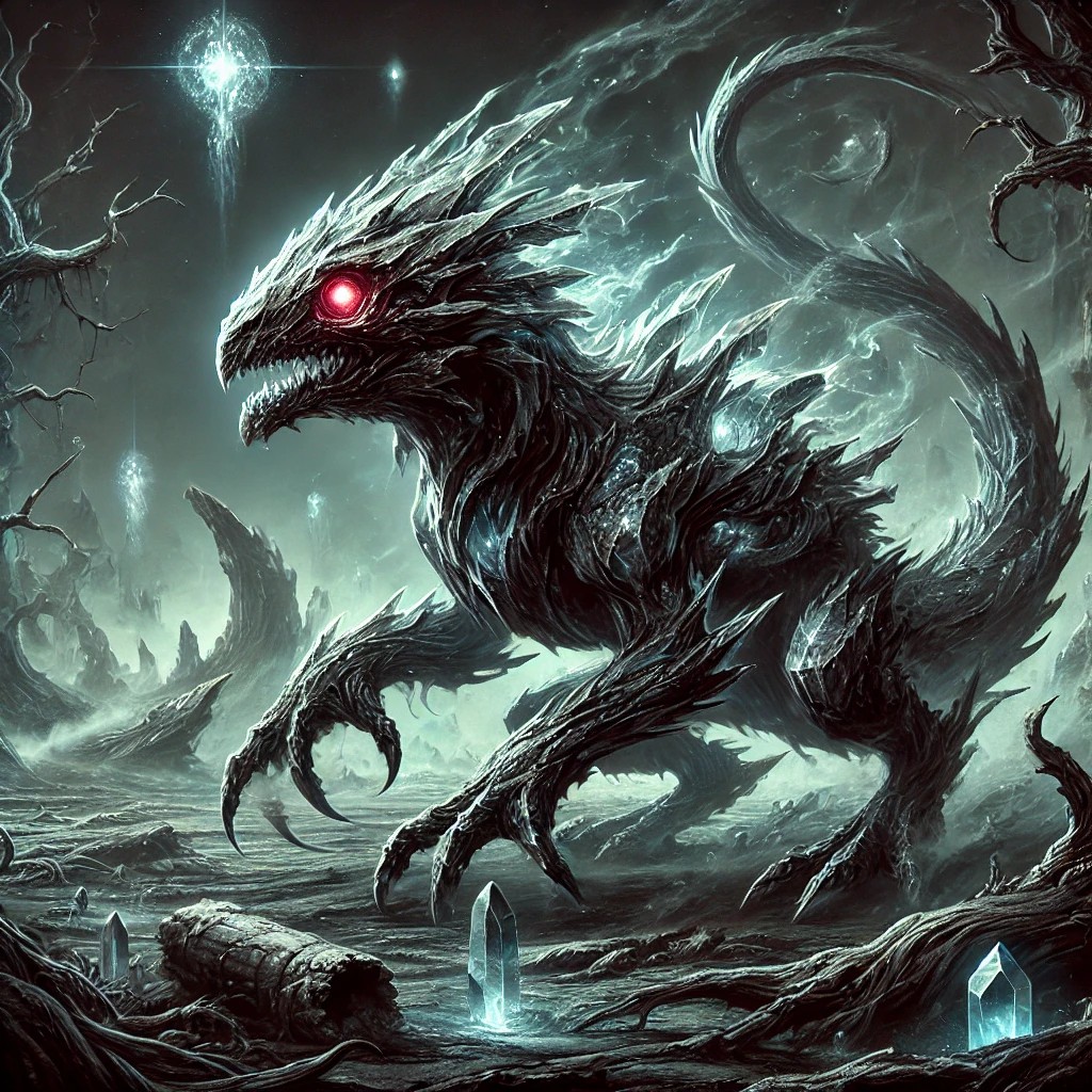 The image features a haunting crystal lizard infused with the death element, slithering ominously through a dark, mystical wasteland. Its sleek, armored body is sculpted from translucent, obsidian-like crystal, with eerie veins of dark energy pulsing through its jagged scales. Its hollow, glowing red eyes emit a sinister aura, hinting at an ancient, spectral force.