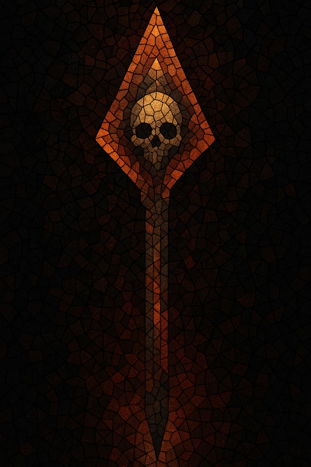 This artwork is a digital abstract mosaic depicting a spear. The spear is constructed from irregular polygonal tiles in shades of red, orange, and dark brown, giving it a fiery yet ominous look. At the spearhead, a skull motif emerges within the mosaic, symbolizing the element of death. The skull is rendered in lighter tones, making it stand out against the darker spear shaft and background.