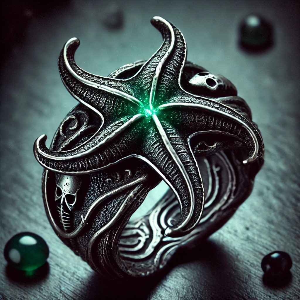 The Death Starfish Ring is crafted from dark textured metal, such as blackened silver or oxidized steel. It features a starfish with five arms spread out, intricately engraved with subtle cracks and skeletal patterns, symbolizing its connection to death and regeneration. The starfish’s body emits a faint, eerie glow of green or cold blue light, enhancing its mysterious, otherworldly presence. The starfish’s arms gently wrap around the band, adding a sense of fluidity and movement.