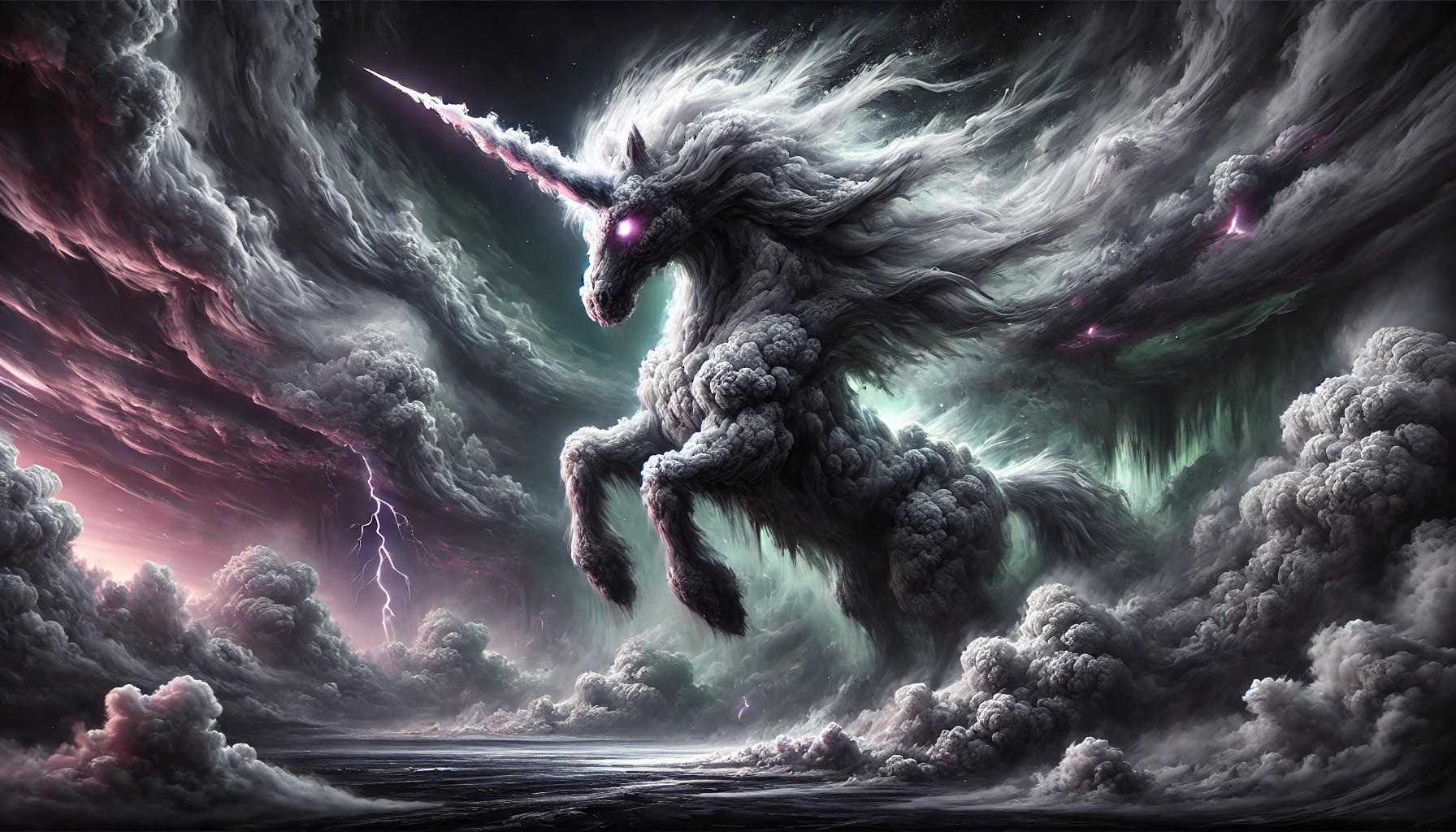 The image presents a hauntingly beautiful scene of a colossal unicorn-shaped cloud looming in a dark, stormy sky. Its body is composed of thick, swirling storm clouds, giving it a ghostly yet majestic presence. Wisps of mist form its mane and tail, slowly dissolving into the surrounding sky, as if the creature is fading into the void.