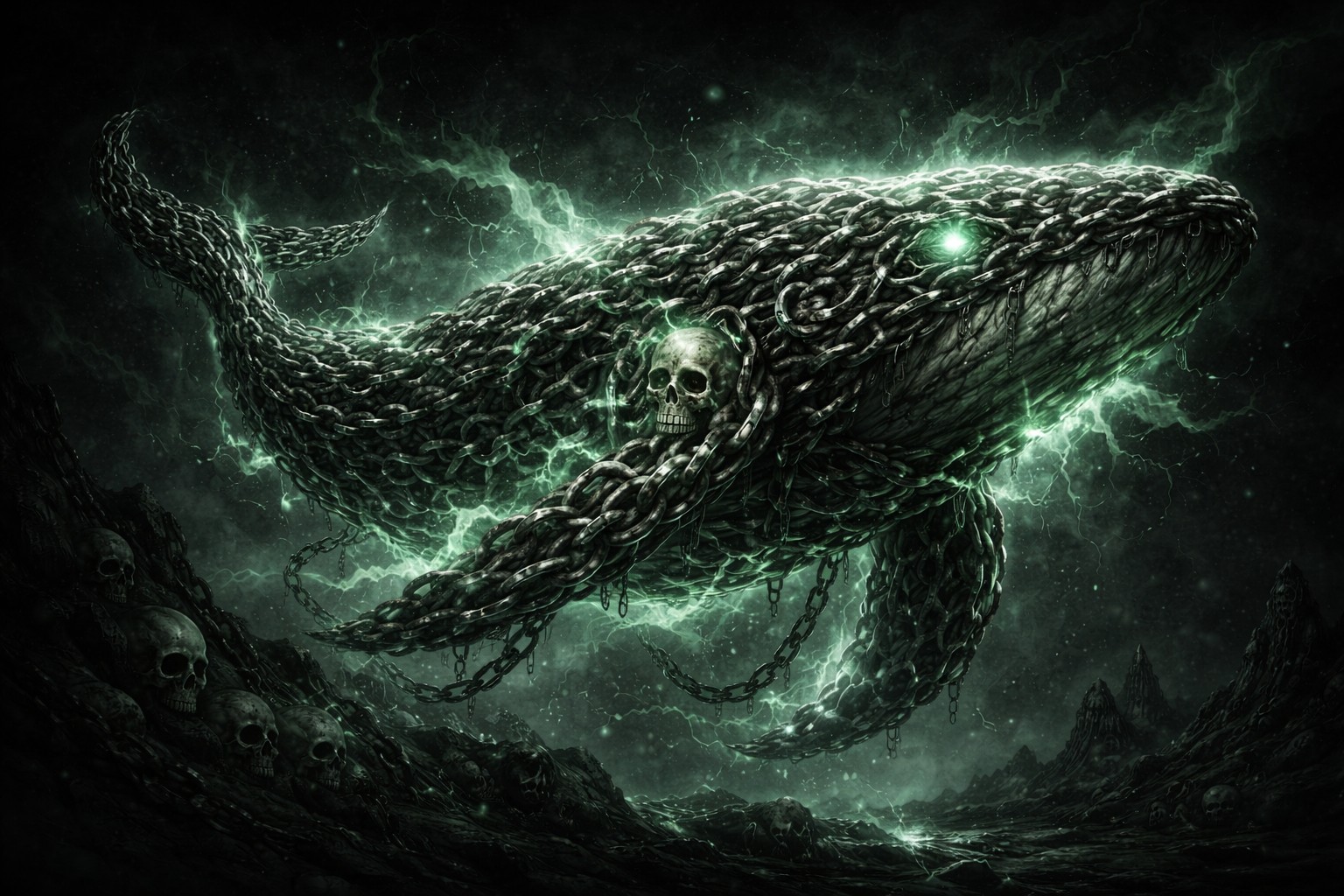 A colossal whale made of black, corroded chains glides through a dead, mist-choked sea, its bulk half-faded into shadow like a ghost too heavy to sink. The links that form its body clatter and drag, glowing faintly with sickly green necrotic light that seeps from the gaps like poisoned fog. A single luminous eye burns in its head, cold and unblinking, while hanging chains trail beneath it like drowned tendrils.